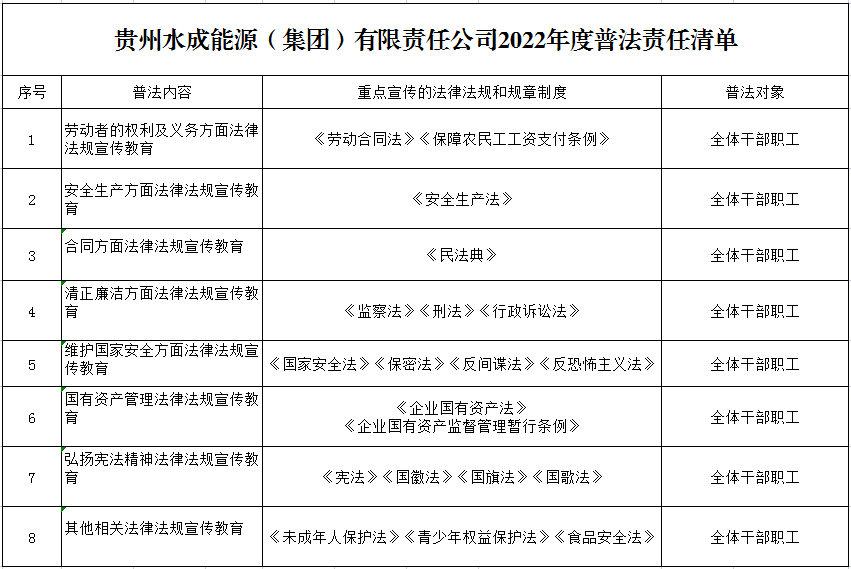 貴州水成能源集團有限責任公司2022年度普法責任清單